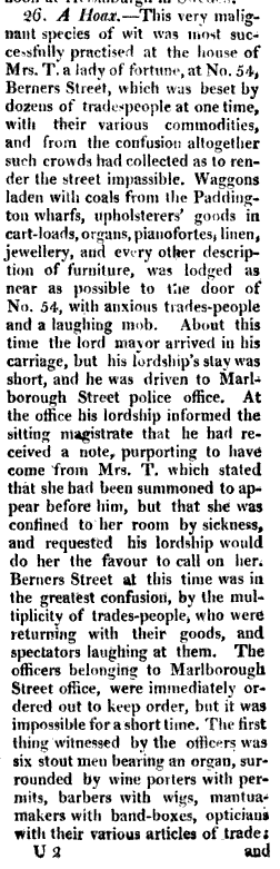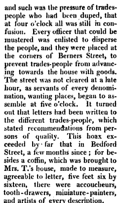 In 1810, on November 26th to be exact, one singular event occurred in London which could win the award for funniest historical event (a low bar there…) The event has since become known as The Berners Street Hoax, and although there are many variations on the details and many accounts written decades later, there are some newspaper accounts from the time.  The London Annual Register for the year 1810  describes the event better than I could.