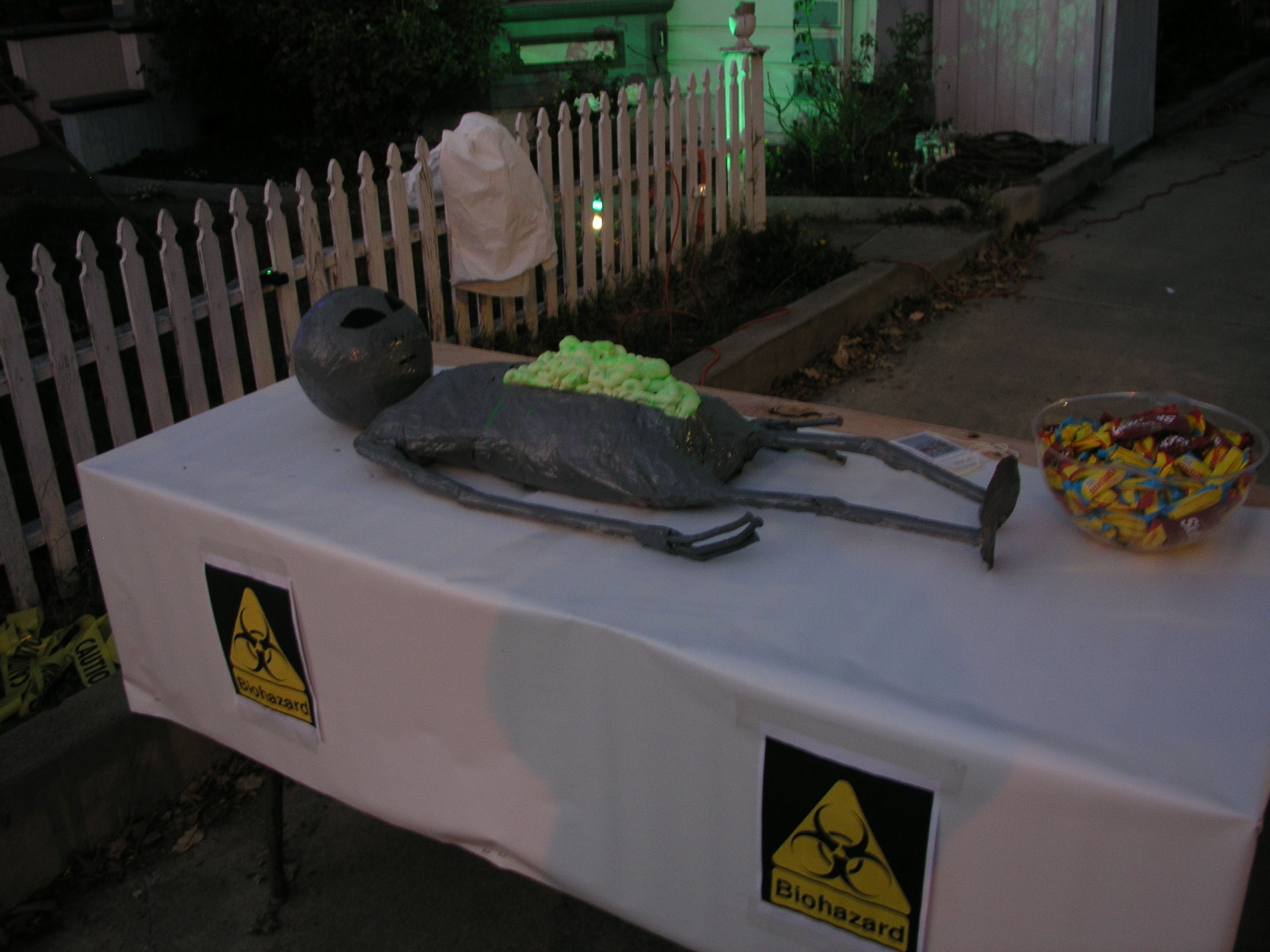 The next few years we modified the mad scientist theme into “Alien Autopsy”. We had a papier-mache dead alien on a slab. The key joke here was that his little three-fingered hand could be made to move via strings under the table. We got more than a couple of screams out of that gag (mostly from adults). We had a “life-sized” crashed flying saucer in the front yard one year, and one crashed into the house (not as successful) another year.