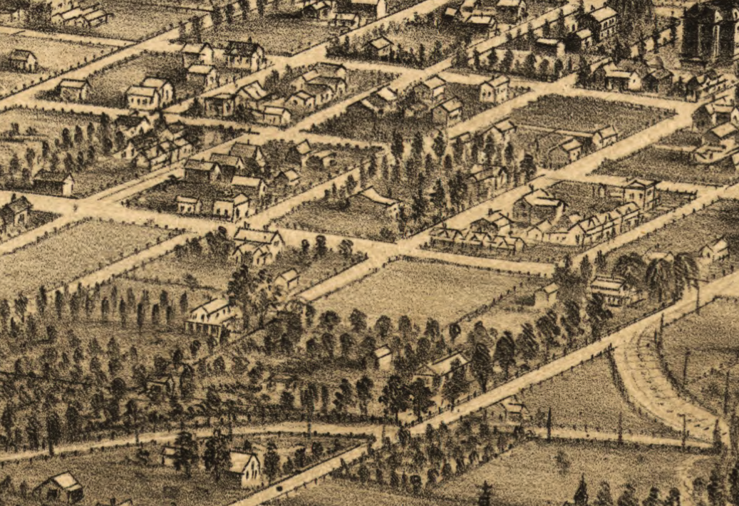One other interesting collection in the Library of Congress is of Panoramic Maps, basically hand-drawn aerial views which the artist (with varying accuracy) filled in by walking up and down the streets drawing in the buildings. The picture below is a snippet of a high-resolution download of a panoramic view of San Jose, California in 1869, showing my neighborhood, although I am sure none of the houses shown exist anymore (if they ever did…).