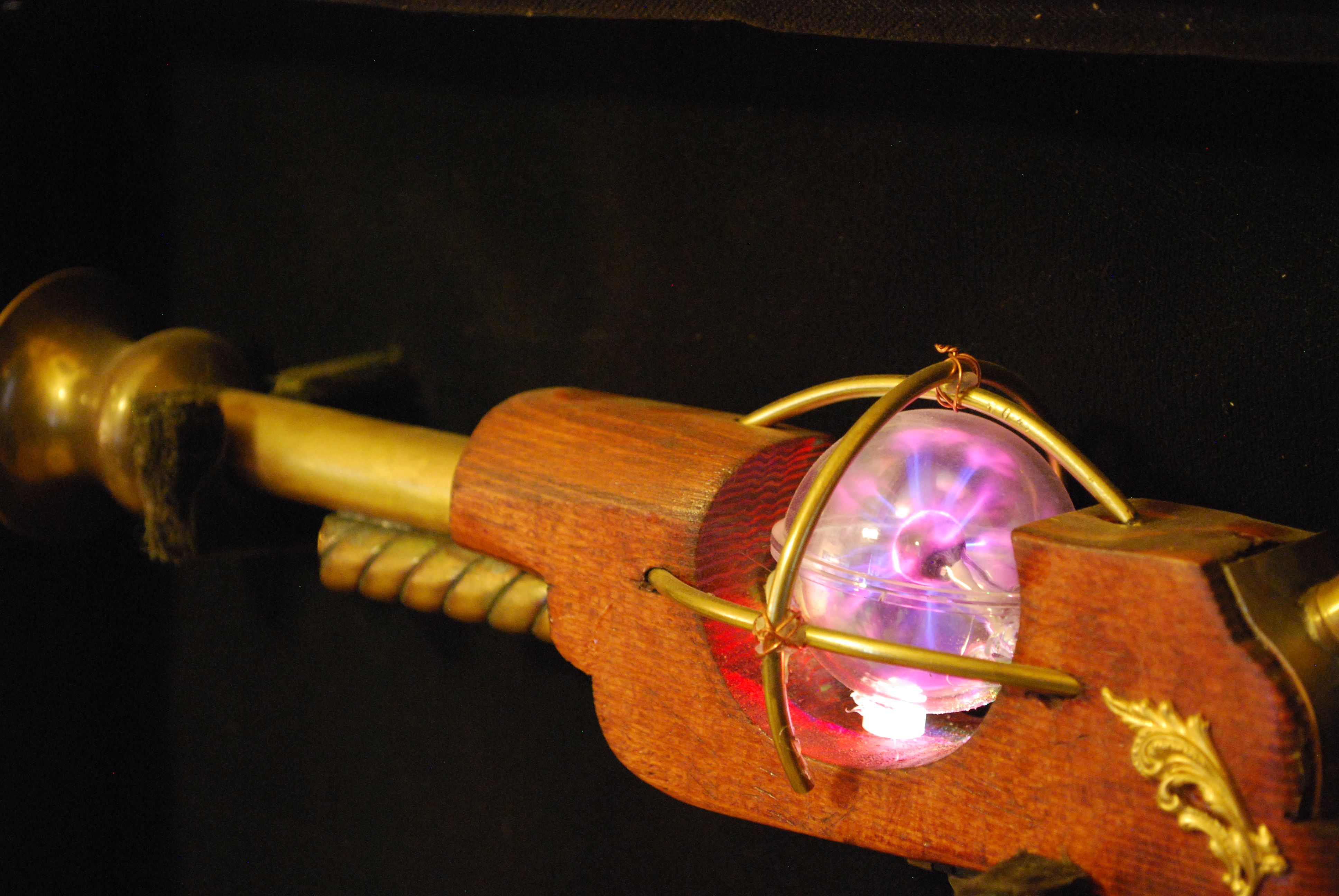 My ultimate inspiration was seeing a steampunked electric guitar on display a few years ago at Clockwork Alchemy, the San Jose steampunk con. The guitar incorporated a small plasma globe into its design and I thought it the perfect piece of steampunk technology. (Unfortunately, I can’t find a photo of this guitar on line, but if anyone knows its maker, please let me know and I’ll suitably recognize him/her.)