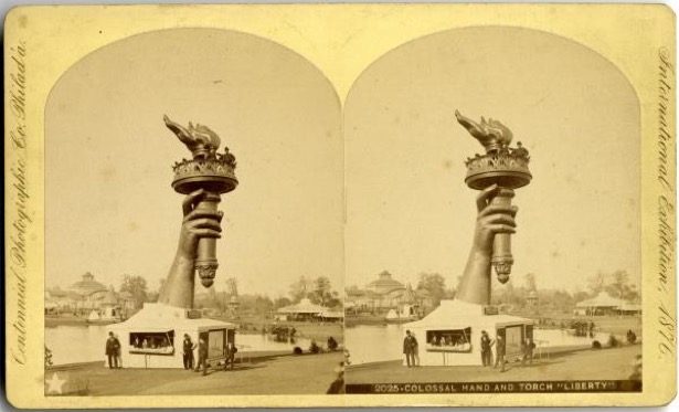 The 1876 Centennial Exhibition in Philadelphia was the subject of many stereoviews. Here the torch of the Statue of Liberty is displayed to help raise funds to erect the statue’s pedestal in New York Harbor.