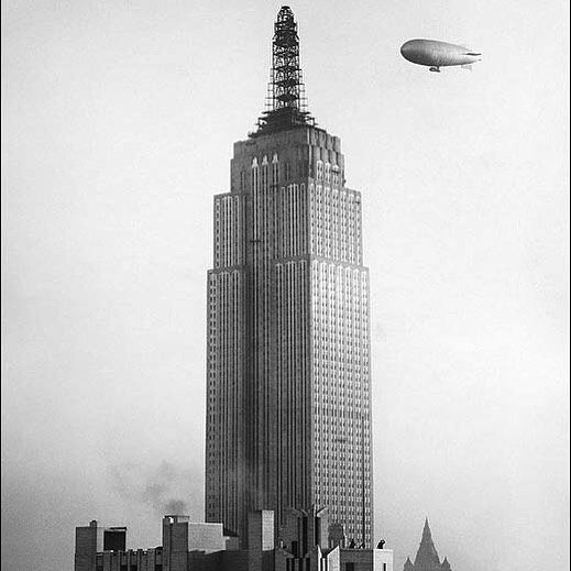 At about the same time that the Graf Zeppelin was starting passenger flights, New York real estate moguls were vying with each other to build the world’s tallest building. The two main competitors were two Art Deco gems—the Chrysler Building and the Empire State Building. Over time the buildings’ publicly disclosed designs increased in height repeatedly. At one point, the Chrysler Building architects designed a spire to be built inside the framework and raised suddenly for maximum PR effect. This stunt brought the height of the Chrysler Building to within only 4 feet that of the Empire State building, which could easily be surpassed by a further smaller spire. So, the architects of the Empire State Building then designed and built a 200-foot spire to be used as a mooring mast for airships, solving two problems at once: providing a Midtown airship port, and securing the Empire State Building as the tallest building on Earth.