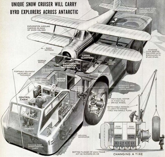 Admiral Byrd commanded several Antarctic expeditions over the decades from the 1930s to the 1950s. On his third expedition, Byrd delivered what he hoped would be an innovative vehicle, the Antarctic Snow Cruiser to the Little America base. The vehicle was designed by Thomas Poulter, a veteran of Byrd’s previous expedition, and was built at the Pullman Company. Its dimensions were huge: 17 meters long and 61 meters wide. During its journey to Boston where it was to be loaded onto the ship to Antarctica, its size caused steering problems, not to mention traffic jams in the cities it passed through.